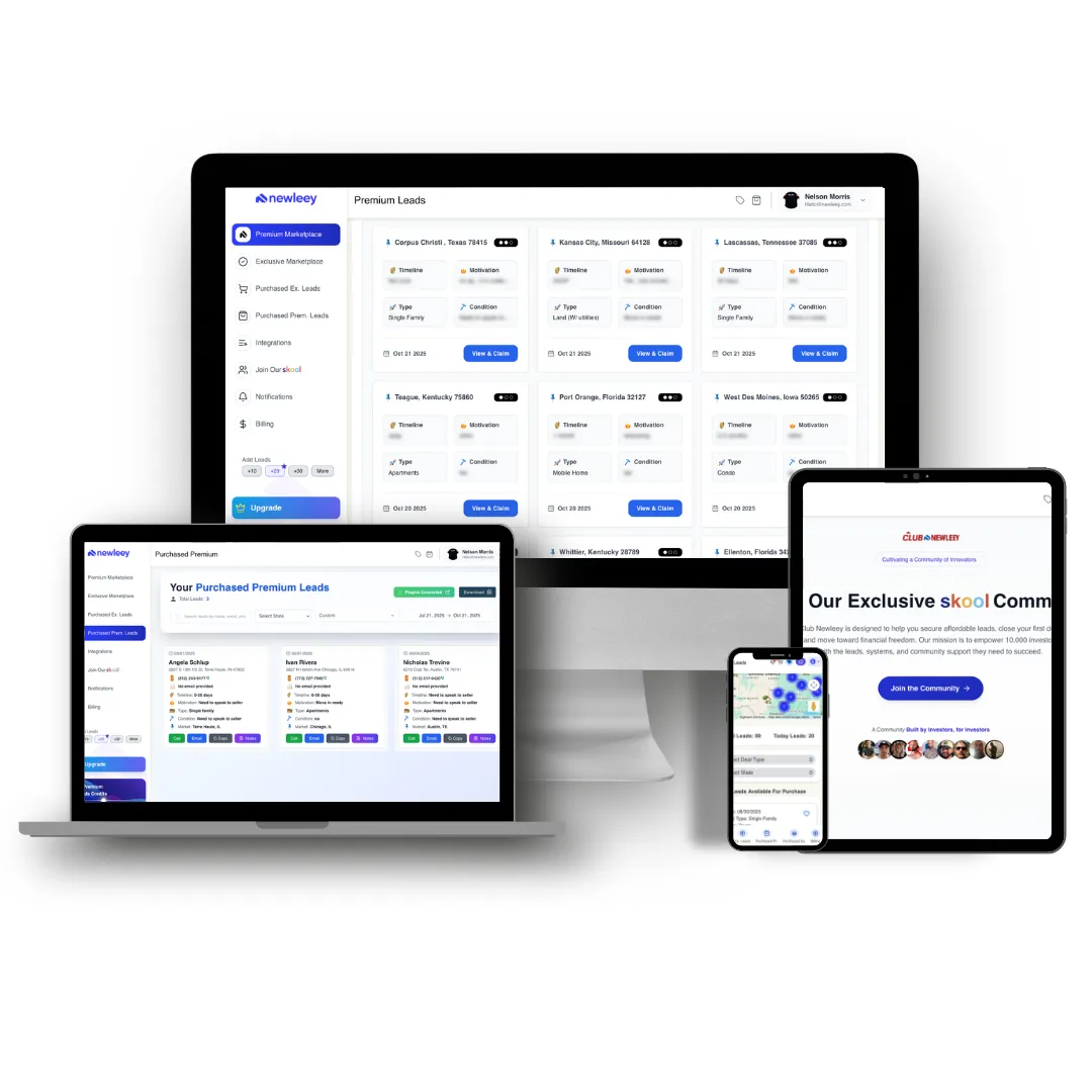 Join our free training where we’ll show you step-by-step how to wholesale — then get instant access to motivated seller leads inside Newleey.